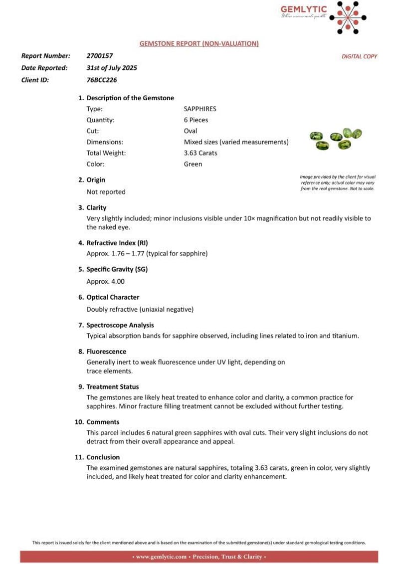Conclusion: The Examined Gemstones Are Natural Sapphires, Totaling 3.63 Carats, Green In Color, Very Slightly Included, And Likely Heat Treated For Color And Clarity Enhancement.