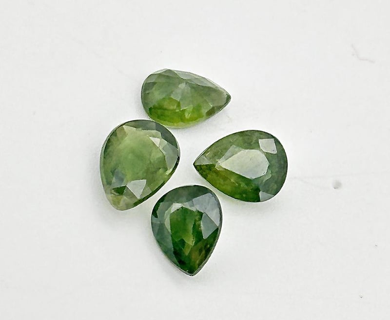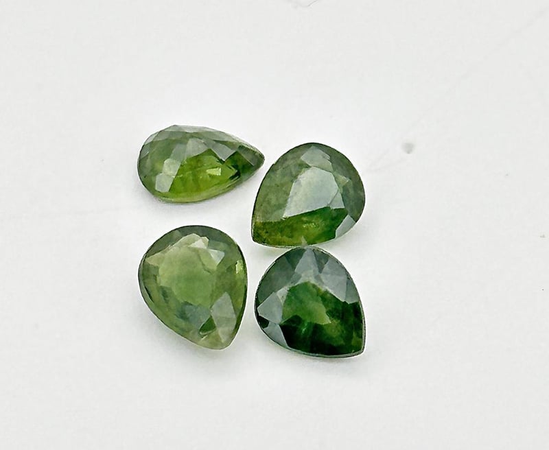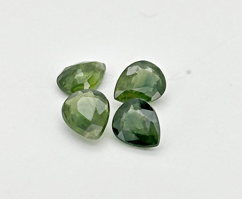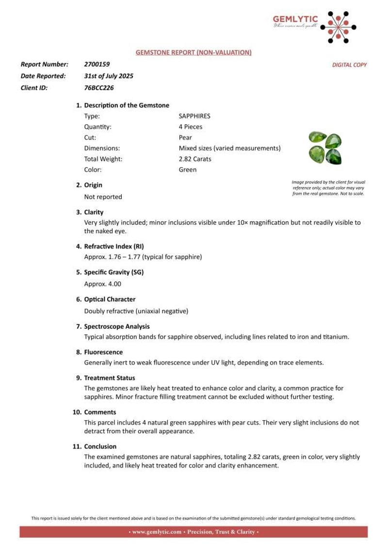 SAPPHIRES - 2.82 CARATS - GREEN Quantity: 4 PcsReport Number: 2700159Clarity: Very Slightly Included; Minor Inclusions Visible Under 10× Magnification But Not Readily Visible To The Naked Eye.Measurements: Mixed SizesTreatments: The Gemstones Are Likely Heat Treated To Enhance Color And Clarity, A Common Practice For Sapphires. Minor Fracture Filling Treatment Cannot Be Excluded Without Further Testing.Origin: Not ReportedRefractive Index: Approx. 1.76 – 1.77 (Typical For Sapphire)Specific Gravity: Approx. 4.00Spectroscope Analysis: Typical Absorption Bands For Sapphire Observed, Including Lines Related To Iron And Titanium.Fluorescence: Generally Inert To Weak Fluorescence Under Uv Light, Depending On Trace Elements.Comments: This Parcel Includes 4 Natural Green Sapphires With Pear Cuts. Their Very Slight Inclusions Do Not Detract From Their Overall Appearance.Conclusion: The Examined Gemstones Are Natural Sapphires, Totaling 2.82 Carats, Green In Color, Very Slightly Included, And Likely Heat Treated For Color And Clarity Enhancement. 0+55