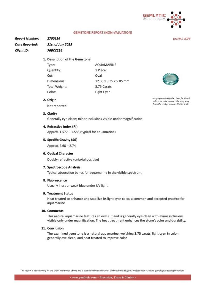 Conclusion: The Examined Gemstone Is A Natural Aquamarine, Weighing 3.75 Carats, Light Cyan In Color, Generally Eye-Clean, And Heat Treated To Improve Color.