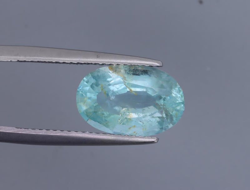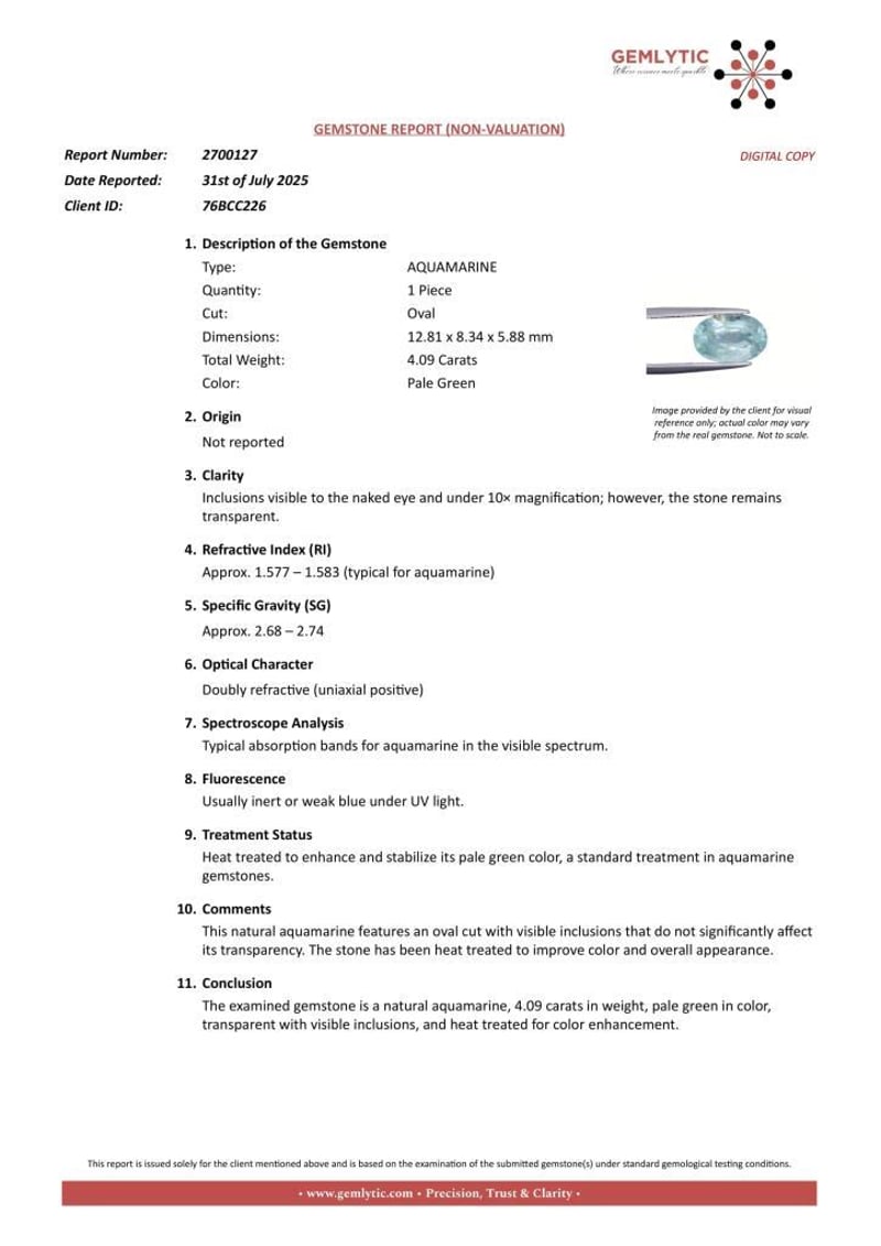 Conclusion: The Examined Gemstone Is A Natural Aquamarine, 4.09 Carats In Weight, Pale Green In Color, Transparent With Visible Inclusions, And Heat Treated For Color Enhancement.