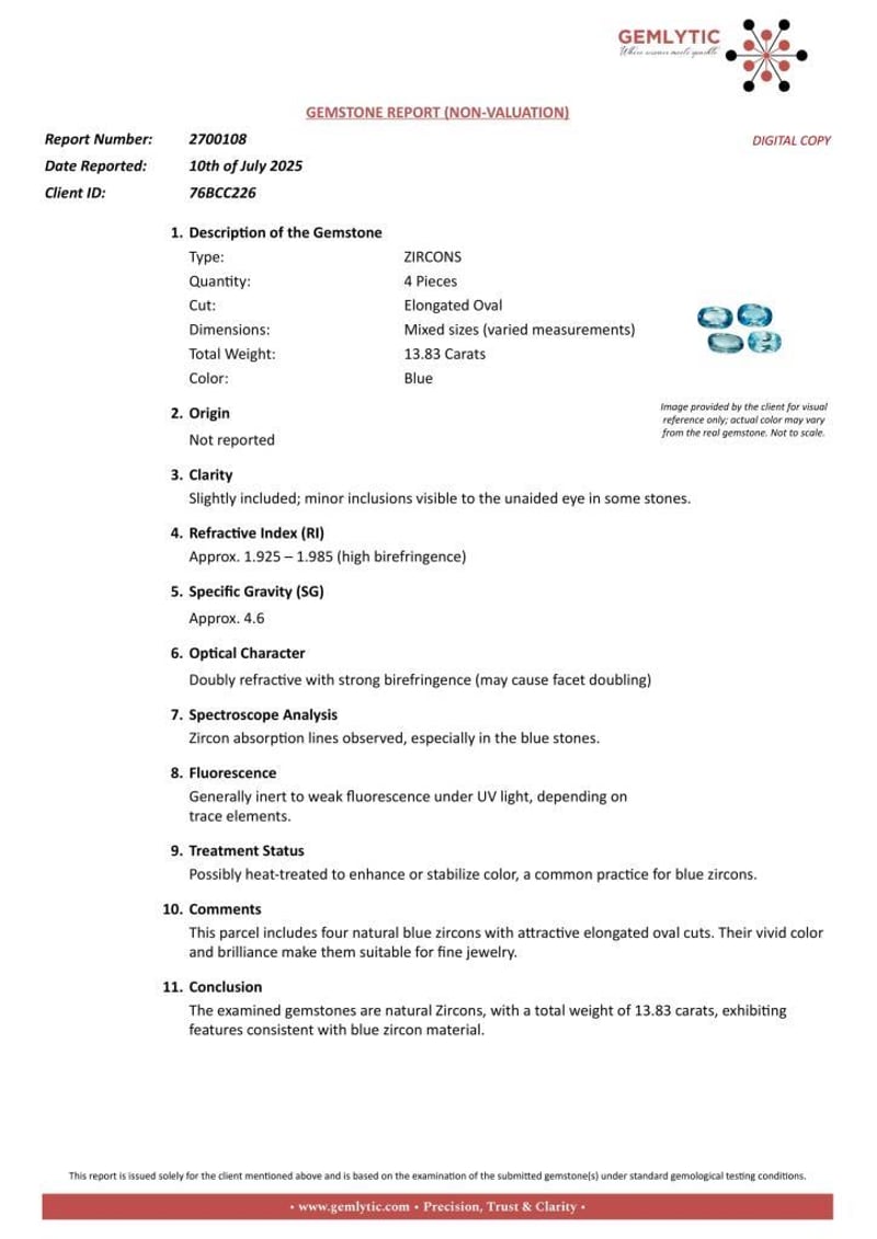 Conclusion: The Examined Gemstones Are Natural Zircons, With A Total Weight Of 13.83 Carats, Exhibiting Features Consistent With Blue Zircon Material.