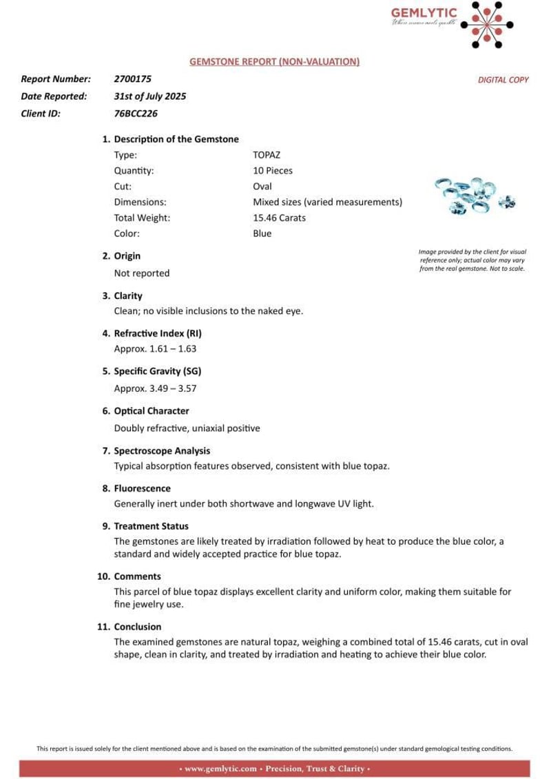 Conclusion: The Examined Gemstones Are Natural Topaz, Weighing A Combined Total Of 15.46 Carats, Cut In Oval Shape, Clean In Clarity, And Treated By Irradiation And Heating To Achieve Their Blue Color.