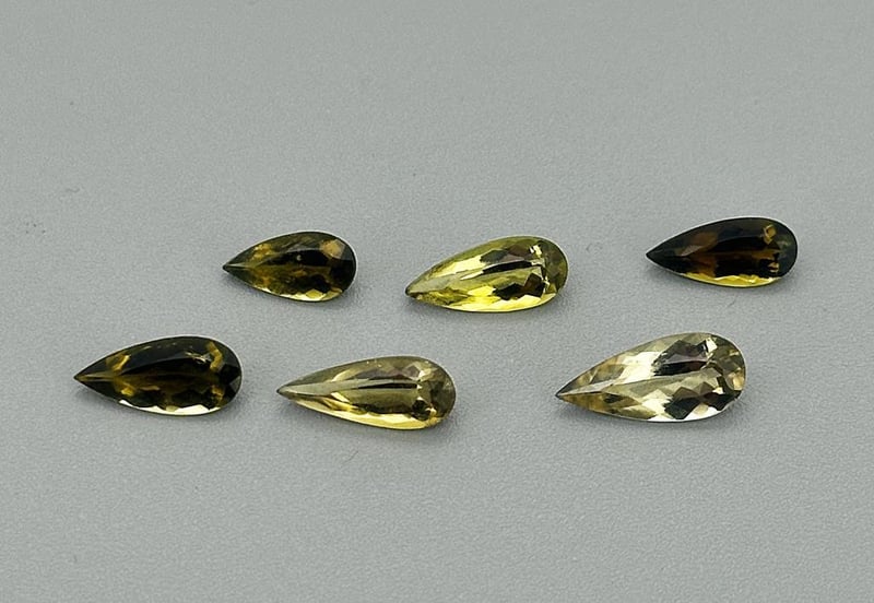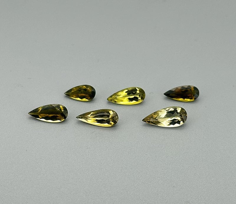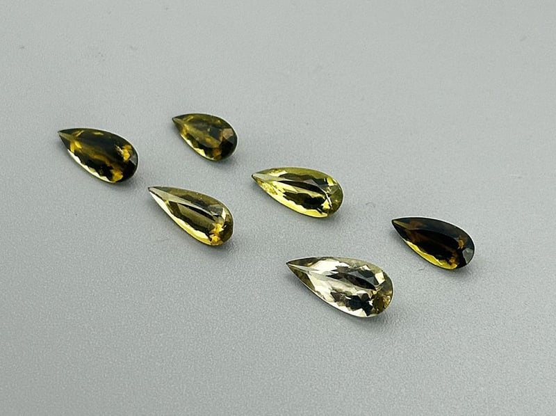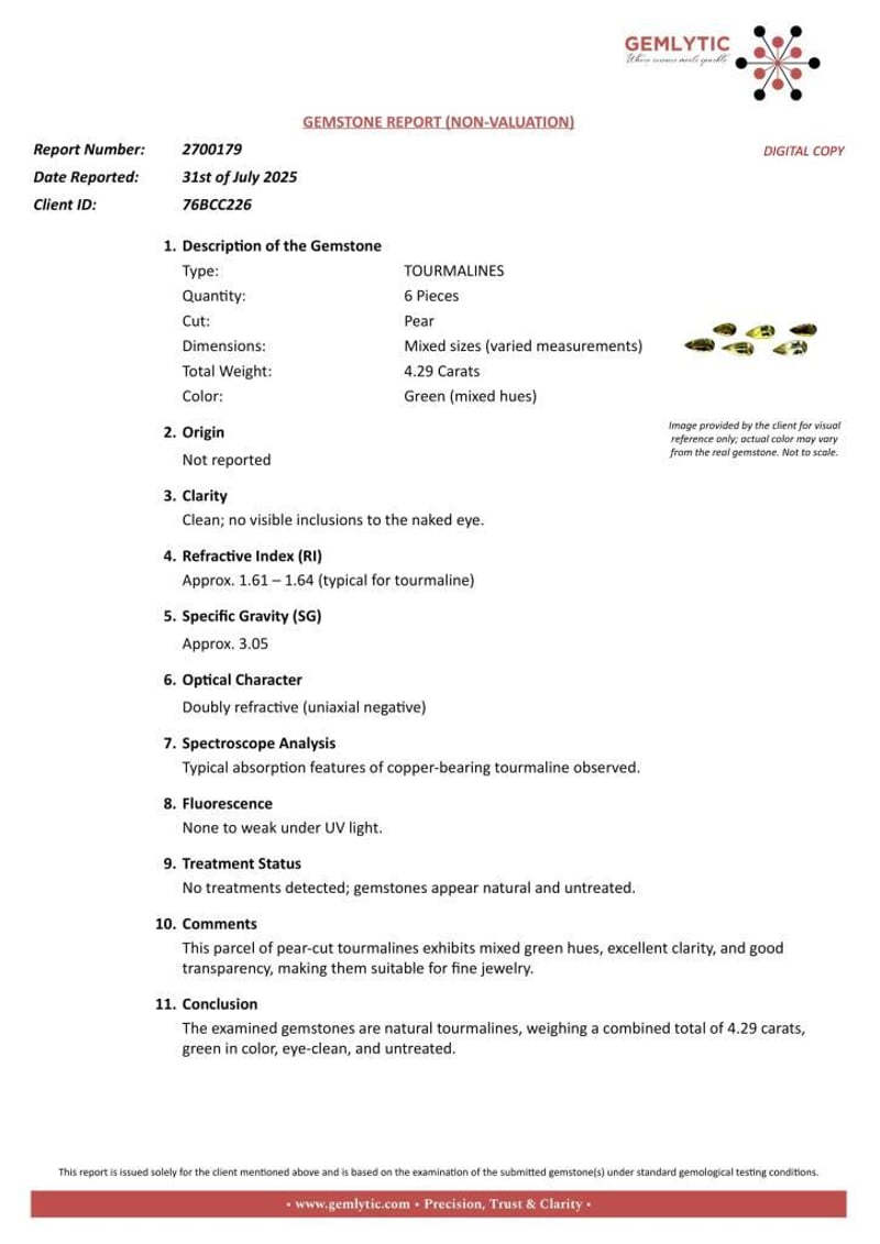 TOURMALINES - 4.29 CARATS - GREEN (MIXED HUES) Quantity: 6 PcsReport Number: 2700179Clarity: Clean; No Visible Inclusions To The Naked Eye.Measurements: Mixed SizesTreatments: No Treatments Detected; Gemstones Appear Natural And Untreated.Origin: Not ReportedRefractive Index: Approx. 1.61 – 1.64 (Typical For Tourmaline)Specific Gravity: Approx. 3.05Spectroscope Analysis: Typical Absorption Features Of Copper-Bearing Tourmaline Observed.Fluorescence: None To Weak Under Uv Light.Comments: This Parcel Of Pear-Cut Tourmalines Exhibits Mixed Green Hues, Excellent Clarity, And Good Transparency, Making Them Suitable For Fine Jewelry.Conclusion: The Examined Gemstones Are Natural Tourmalines, Weighing A Combined Total Of 4.29 Carats, Green In Color, Eye-Clean, And Untreated. 0+75