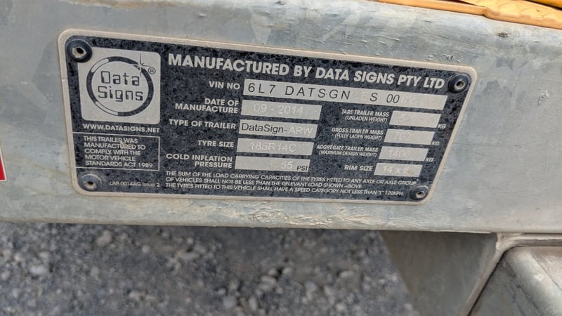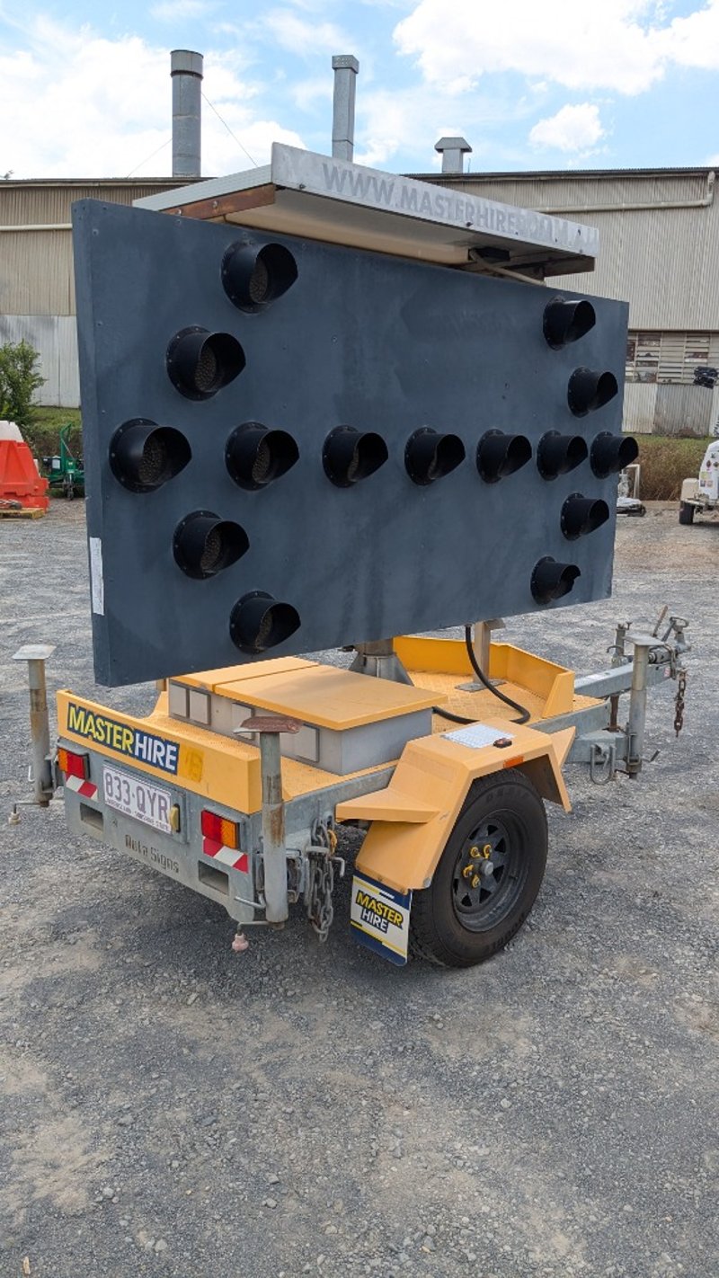 Portable Traffic Arrow Board Brand: DATA SIGNS Model: TYPE-C ARROWBOARD VIN:6L7DATSGNES000287 Serial no: 37408 date of Manufacture: 09/2014 Description/ Extras: Leaf spring suspension, Stabilizing Legs, Jockey wheel, Solar Panel NOTE: SAID TO BE IN GOOD WORKING ORDER, INSPECTIONS HIGHLY RECOMMENDED, BUYER TO PROVIDE OWN LABOUR AND TOOLS FOR SAFE REMOVAL OF ASSET Contact: Mark David - 0437 318 344 or [email protected] Collections must occur Friday 21st of November 8am-3pm , Monday 24th to Wednesday 26th November, 8am - 4pm , NO COLLECTIONS SATURDAY OR SUNDAY