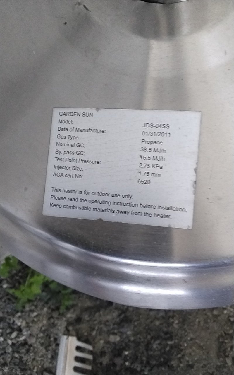 Gas Patio Heater Make, Gameco, Model, UM50 Serial no, 40651003 Description, stainless steel patio heater, said to require new seal on gas bottle end, minus top, Note no gas bottle provided INSPECTION RECOMMENDED Contact: Mark David - 0437 318 344 or [email protected] Location: Toowoomba, QLD Inspection: Wednesday 19th November, 8am -12 Noon Collections must occur Friday 21st of November 8am-3pm , Monday 24th to Wednesday 26th November, 8am - 4pm , NO COLLECTIONS SATURDAY OR SUNDAY