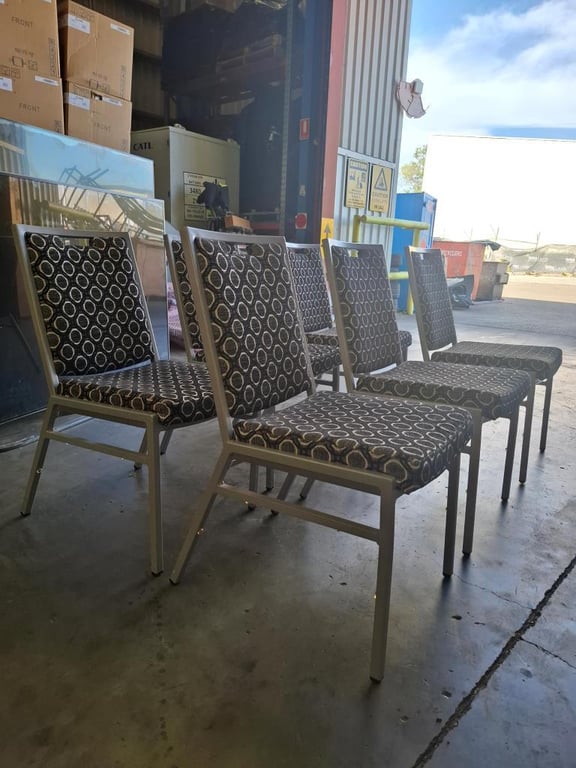 Outdoor chairs, aluminum frame, white & black upholstery x6 Dimensions: H 86cm x W 44.5cm x D 56cm Note: General wear and tear Sold as lot