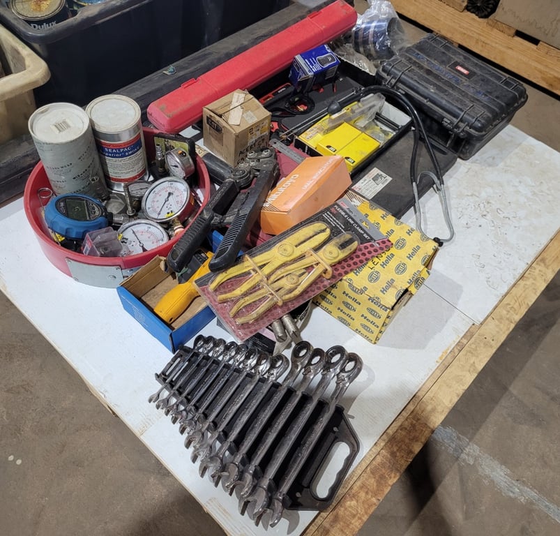 One Pallet holding Various Pressure Gauges, Spanner Set and More. SOLD AS LOT.