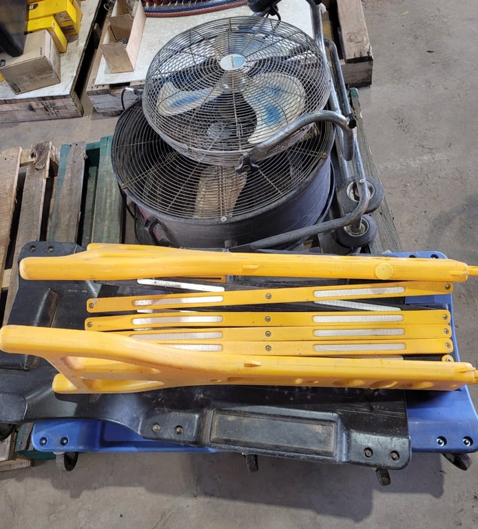 One Pallet holding 2 Dynabreeze Fans, 3 Car Creepers and 1 Collapsing Safety Fence. SOLD as LOT.