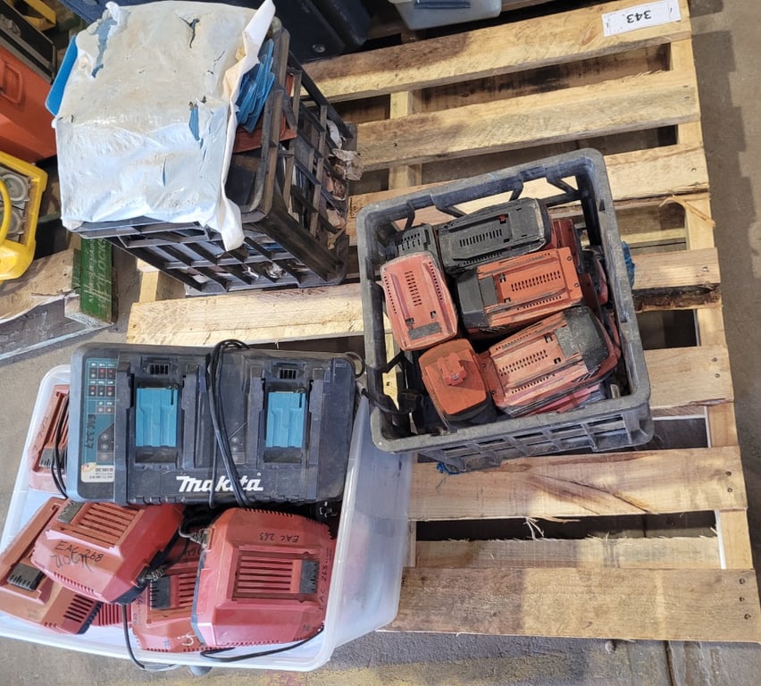 One Pallet holding Various Hilti Batteries and Charge Stations plus a Crate of Shims. SOLD as LOT.