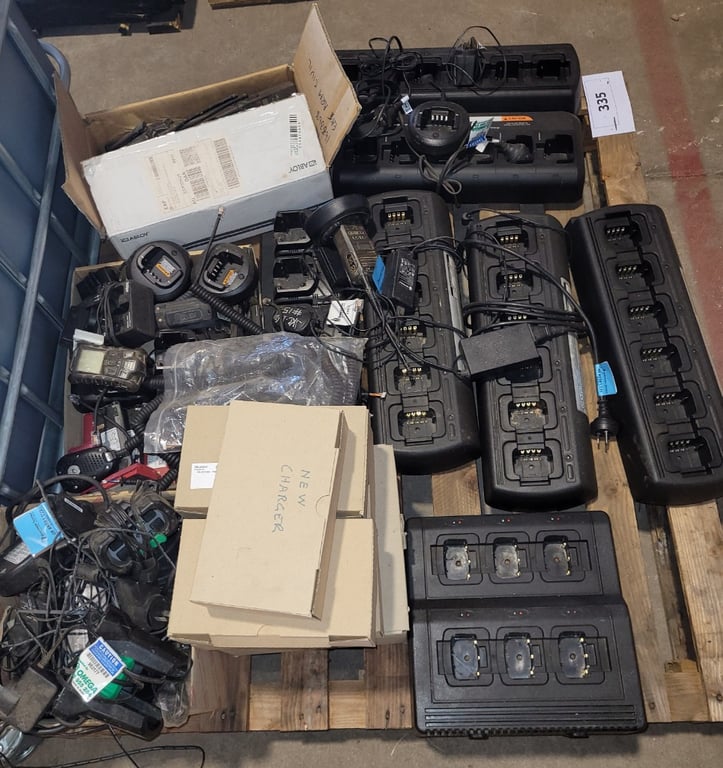 One Pallet holding Various UHF Radios, Radio Chargers and More. Used Condition. SOLD as LOT.