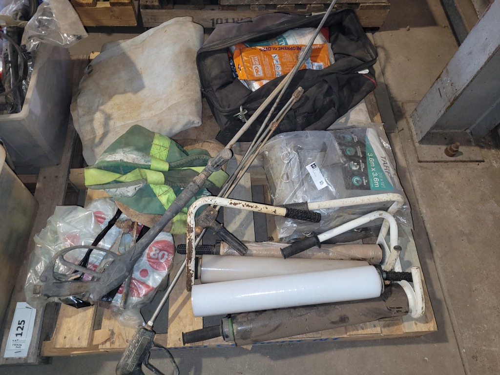 One Pallet holding Various Drop Sheets, Tarpaulins and More. Used Condition. SOLD as LOT.