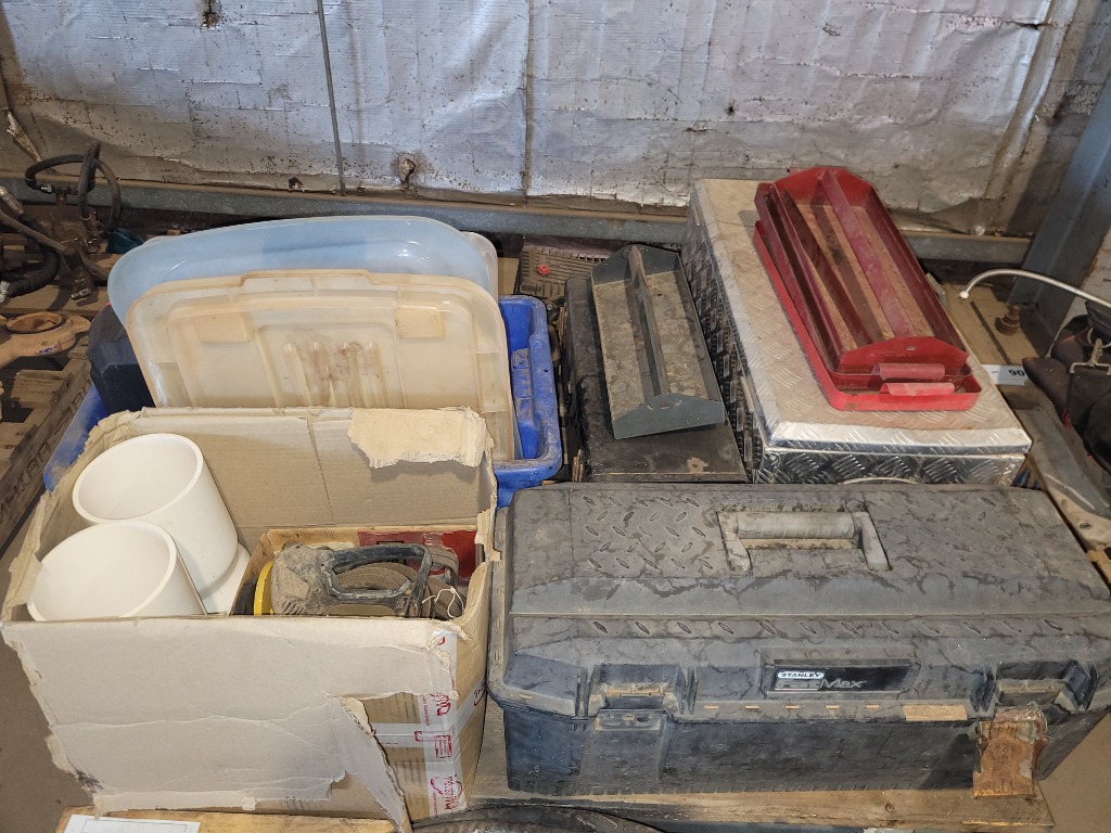 One Pallet holding Various Storage Boxes (empty) and More. Used Condition. SOLD as LOT.