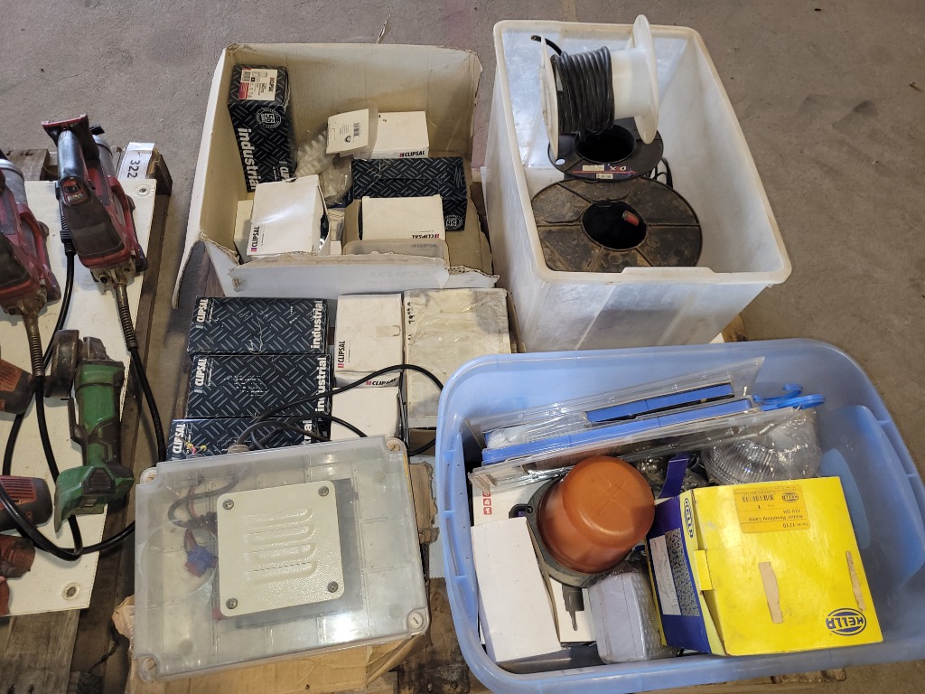 One Pallet holding Various Electrical Equipment including Electrical Clips and More. Used Condition. SOLD as LOT.