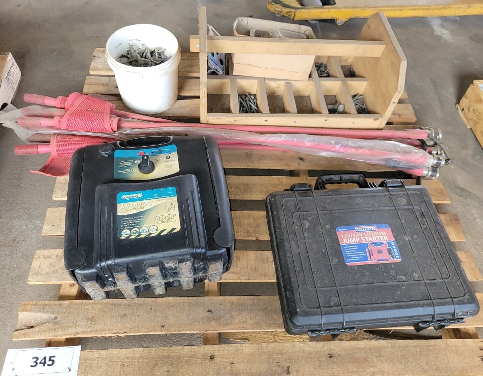One Pallet of 2 Jump Starter Packs, 1 Wooden Tool Box and More. (See photos). SOLD as LOT.