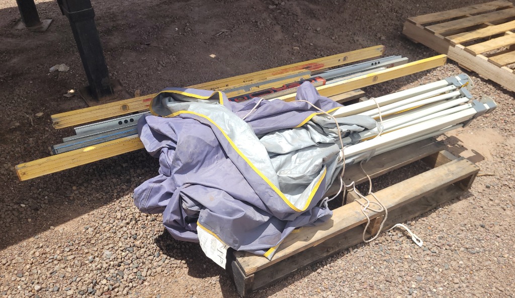 One Pallet holding Various Levels and a Folding Shade. Used Condition. SOLD as LOT.