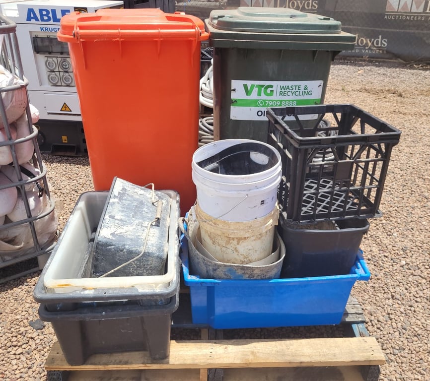 One Pallet holding Various Storage Containers and 2 Wheelie Bins. Used Condition. SOLD as LOT.