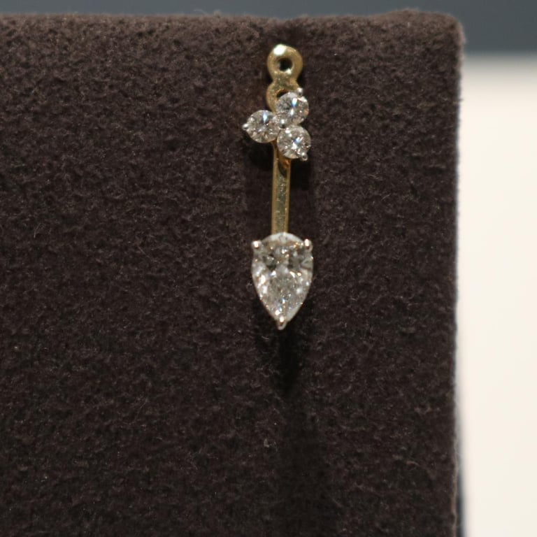 This Is A 18K Yellow Gold Double Diamond Stud Earring Jacket. The Top Stud Sits On The Earlobe, While The Lower Diamond Drop Curves Gracefully Beneath. Upper Stud Features 3 Small Round Diamonds While Lower Stud Featres A Pear Cut.
