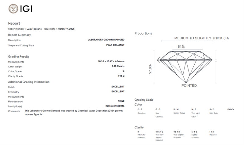 7.10 CARATS G/VVS2 LAB GROWN DIAMOND - IGI CERTIFIED 7.10 Carats G/Vvs2 Lab Grown Diamond - Igi CertifiedCertificate Number - 691586046Color/Clarity - G/Vvs2Shape - PearDimension - 18.20 X 10.47 X 6.06 MmCut - N/ASymmetry - ExcellentFluorescence - NonePolish - ExcellentExternal Video Link - Https://Kn360.S3.Eu-North-1.Amazonaws.Com/691586046.Html Condition: Good - Refer Images 0160773+18