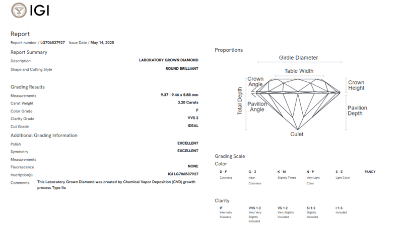 Please note that while all lab grown diamonds listed include certification, the report number or identification may vary upon arrival. This is due to standard manufacturing and batching processes. However, the diamond’s specifications — including carat, color, cut, and clarity — will match or may even exceed those advertised.