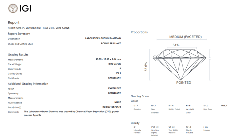 8.02 CARATS F/VS1 LAB GROWN DIAMOND - IGI CERTIFIED