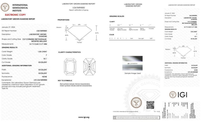 1.55 CARAT RADIANT SHAPE DIAMOND F/VS1 Igi Certificate # Lg 618494583 Laser Inscribed : Labgrown Igi Lg 618494583 Cut : Excellent Polish : Excellent Symmetry : Excellent Flourescence : None Type : Cvd Condition: Good - Refer Images 0488963+10146