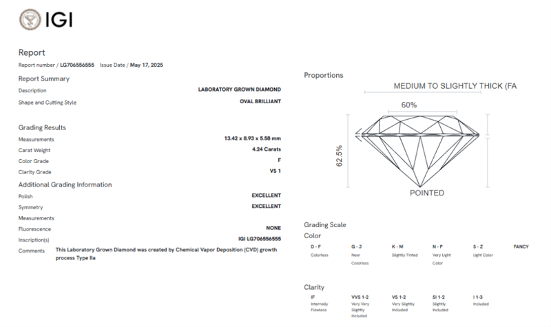 4.24 CARATS F/VS1 LAB GROWN DIAMOND - IGI CERTIFIED 4.24 Carats F/Vs1 Lab Grown Diamond - Igi CertifiedCertificate Number - 706556555Color/Clarity - F/Vs1Shape - OvalDimension - 13.42 X 8.93 X 5.58 MmCut - N/ASymmetry - ExcellentFluorescence - NonePolish - ExcellentExternal Video Link - Https://V360.Diamonds/C/Dbb52Dcd-9141-4945-B169-9345Febe3C24?M=I&A=706556555 Condition: Good - Refer Images 0160773+24