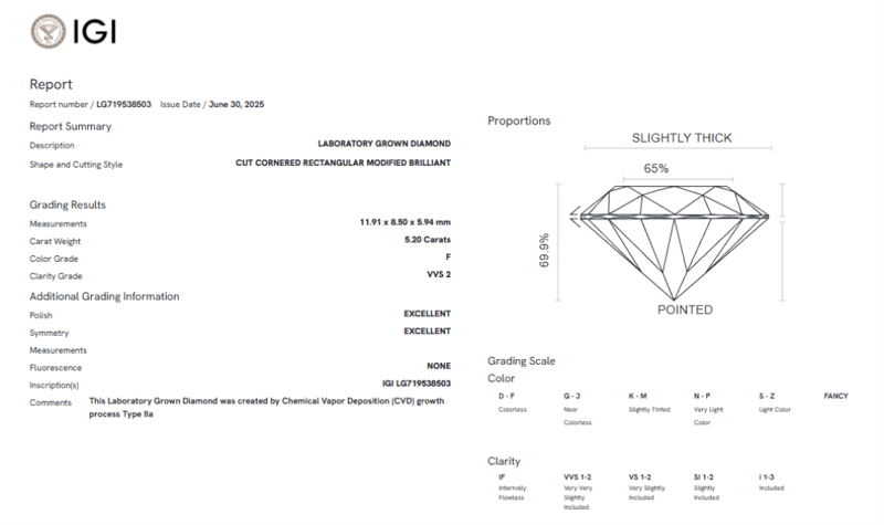 5.20 CARATS F/VVS2 LAB GROWN DIAMOND - IGI CERTIFIED 5.20 Carats F/Vvs2 Lab Grown Diamond - Igi CertifiedCertificate Number - 719538503Color/Clarity - F/Vvs2Shape - RadiantDimension - 11.91 X 8.50 X 5.94 MmCut - N/ASymmetry - ExcellentFluorescence - NonePolish - ExcellentExternal Video Link - Https://V360.Diamonds/C/Dbb52Dcd-9141-4945-B169-9345Febe3C24?M=I&A=719538503 Condition: Good - Refer Images 0160773+41