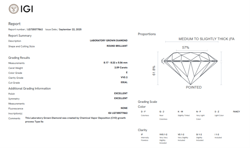 2.09 CARATS E/VVS2 LAB GROWN DIAMOND - IGI CERTIFIED 2.09 Carats E/Vvs2 Lab Grown Diamond - Igi CertifiedCertificate Number - 735577862Color/Clarity - E/Vvs2Shape - RoundDimension - 8.17 X 8.22 - 5.06 MmCut - IdealSymmetry - ExcellentFluorescence - NonePolish - ExcellentExternal Video Link - Https://Kn360.S3.Eu-North-1.Amazonaws.Com/735577862.Html Condition: Good - Refer Images 0160773+85