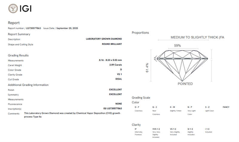 2.09 CARATS D/VS1 LAB GROWN DIAMOND - IGI CERTIFIED 2.09 Carats D/Vs1 Lab Grown Diamond - Igi CertifiedCertificate Number - 735577863Color/Clarity - D/Vs1Shape - RoundDimension - 8.16 X 8.23 - 5.03 MmCut - IdealSymmetry - ExcellentFluorescence - NonePolish - ExcellentExternal Video Link - Https://Kn360.S3.Eu-North-1.Amazonaws.Com/735577863.Html Condition: Good - Refer Images 0160773+86