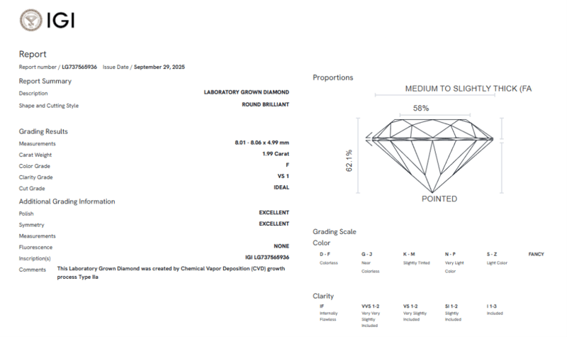 1.99 CARATS F/VS1 LAB GROWN DIAMOND - IGI CERTIFIED