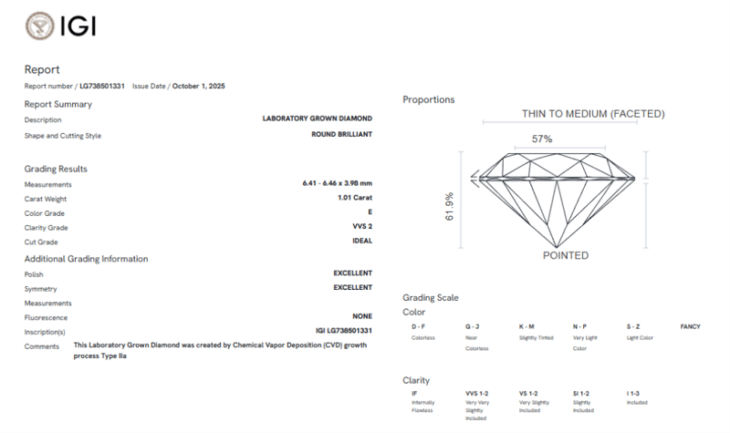 1.01 CARATS E/VVS2 LAB GROWN DIAMOND - IGI CERTIFIED 1.01 Carats E/Vvs2 Lab Grown Diamond - Igi CertifiedCertificate Number - 738501331Color/Clarity - E/Vvs2Shape - RoundDimension - 6.41 X 6.46 - 3.98 MmCut - IdealSymmetry - ExcellentFluorescence - NonePolish - ExcellentExternal Video Link - Https://Kn360.S3.Eu-North-1.Amazonaws.Com/738501331.Html Condition: Good - Refer Images 0160773+109