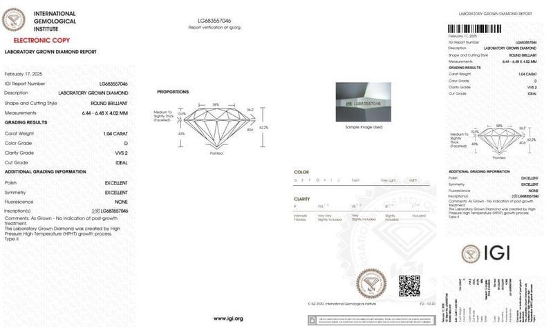 Igi Certificate # Lg 683557046 Laser Inscribed : Labgrown Igi Lg 683557046 Cut : Ideal Polish : Excellent Symmetry : Excellent Flourescence : None Type : Hpht