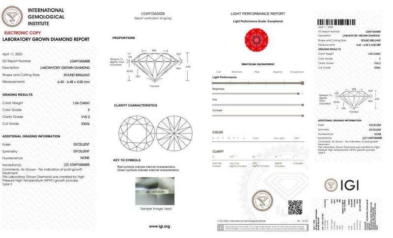 Igi Certificate # Lg 691565458 Laser Inscribed : Labgrown Igi Lg 691565458 Cut : Ideal Polish : Excellent Symmetry : Excellent Flourescence : None Type : Hpht