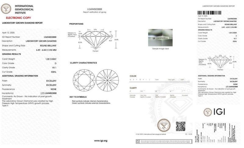 Igi Certificate # Lg 694503888 Laser Inscribed : Labgrown Igi Lg 694503888 Cut : Ideal Polish : Excellent Symmetry : Excellent Flourescence : None Type : Hpht