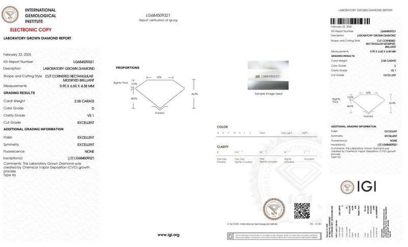 Igi Certificate # Lg 684509321 Laser Inscribed : Labgrown Igi Lg 684509321 Cut : Excellent Polish : Excellent Symmetry : Excellent Flourescence : None Type : Cvd