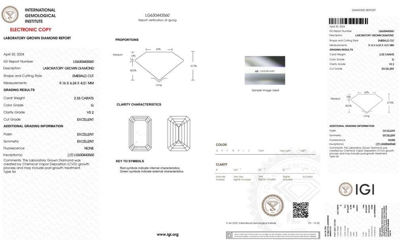 Igi Certificate # Lg 630443560 Laser Inscribed : Labgrown Igi Lg 630443560 Cut : Excellent Polish : Excellent Symmetry : Excellent Flourescence : None Type : Cvd