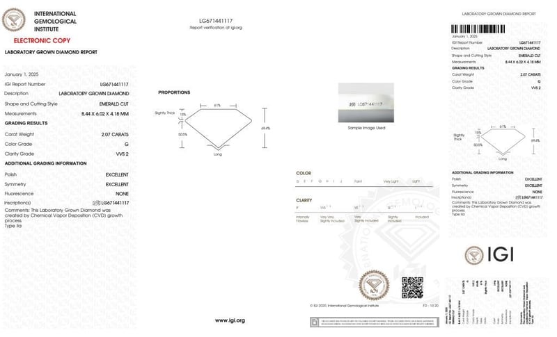 Igi Certificate # Lg 671441117 Laser Inscribed : Labgrown Igi Lg 671441117 Polish : Excellent Symmetry : Excellent Flourescence : None Type : Cvd