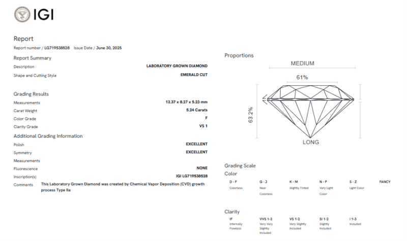 Please note that while all lab grown diamonds listed include certification, the report number or identification may vary upon arrival. This is due to standard manufacturing and batching processes. However, the diamond’s specifications — including carat, color, cut, and clarity — will match or may even exceed those advertised.