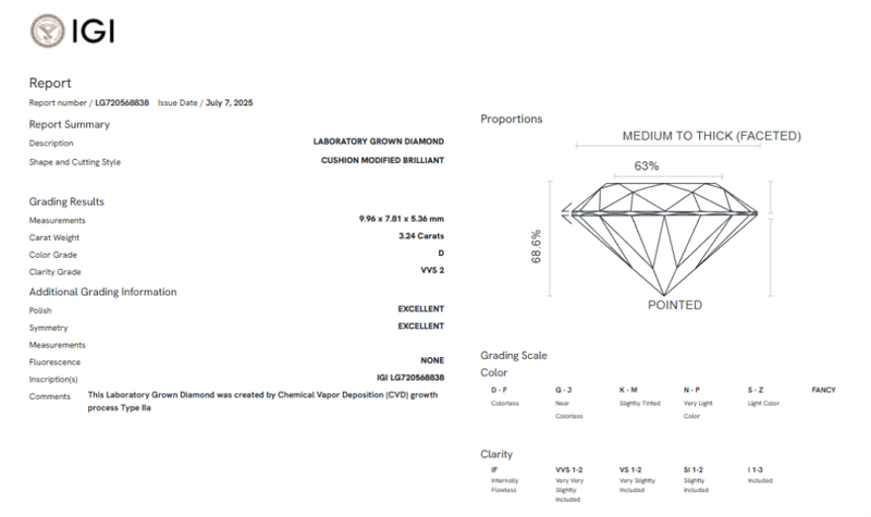 Please note that while all lab grown diamonds listed include certification, the report number or identification may vary upon arrival. This is due to standard manufacturing and batching processes. However, the diamond’s specifications — including carat, color, cut, and clarity — will match or may even exceed those advertised.