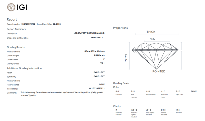 4.53 CARATS F/VS1 LAB GROWN DIAMOND - IGI CERTIFIED