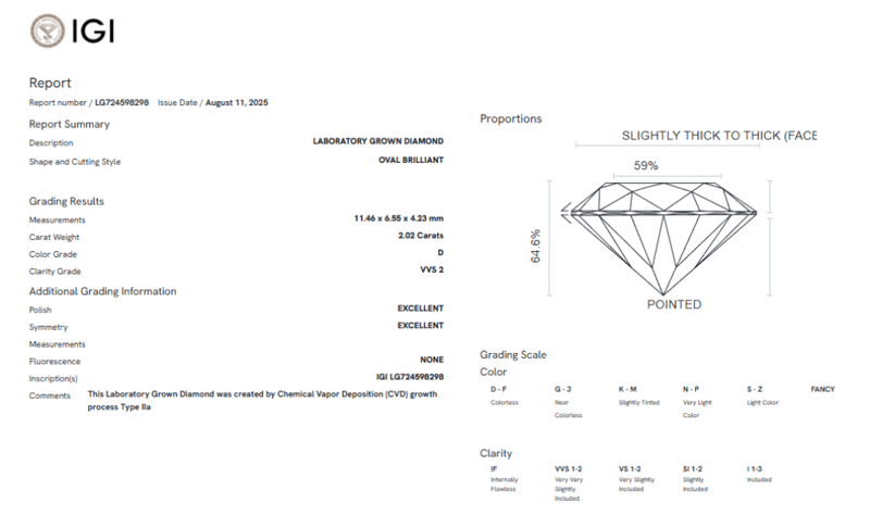 Please note that while all lab grown diamonds listed include certification, the report number or identification may vary upon arrival. This is due to standard manufacturing and batching processes. However, the diamond’s specifications — including carat, color, cut, and clarity — will match or may even exceed those advertised.