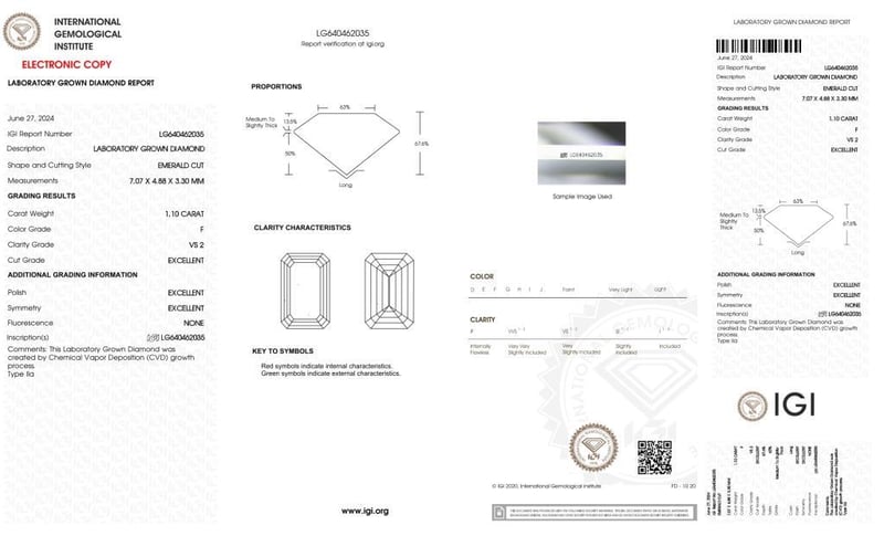 Igi Certificate # Lg 640462035 Laser Inscribed : Labgrown Igi Lg 640462035 Cut : Excellent Polish : Excellent Symmetry : Excellent Flourescence : None Type : Cvd