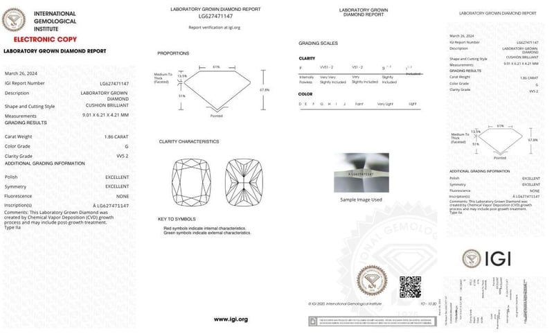 Igi Certificate # Lg 627471147 Laser Inscribed : Labgrown Igi Lg 627471147 Cut : Ideal Polish : Excellent Symmetry : Excellent Flourescence : None Type : Cvd