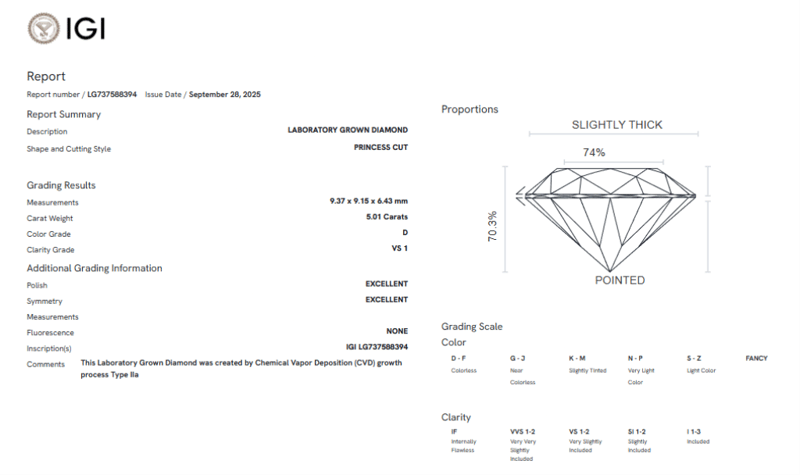 Please note that while all lab grown diamonds listed include certification, the report number or identification may vary upon arrival. This is due to standard manufacturing and batching processes. However, the diamond’s specifications — including carat, color, cut, and clarity — will match or may even exceed those advertised.