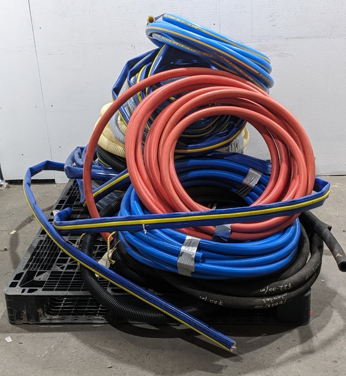 Assorted industrial hoses and tubing, includes red heavy-duty houses, yellow spiral hoses and more...Sold as a lot