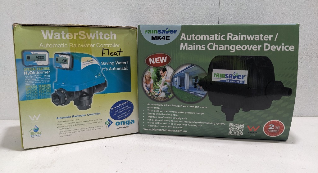 Assorted industrial items, includes rainsaver MK4E automatic rainwater/mains changeover device, manual instructions included and onga water switch automatic rainwater controller part no. 707170, manual instructions included.Sold as a lot.