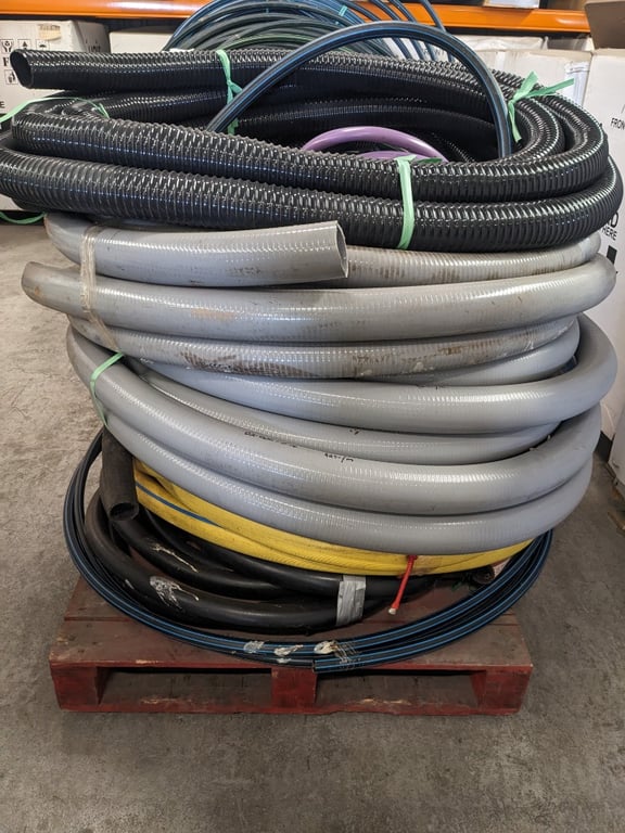 Assorted industrial hoses and tubing, includes black heavy-duty houses, grey spiral hoses and more...Sold as a lot