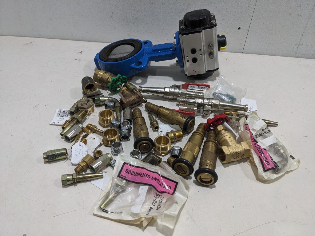 Assorted industrial fittings and valves, includes brass and steel hydraulic, butterfly valve and more...Sold as a lot