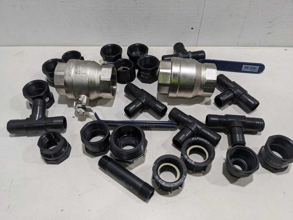 Assorted industrial valves and plastic pipe fittings, includes brass/nickel ball valves, tees, elbows and more..Sold as a lot.
