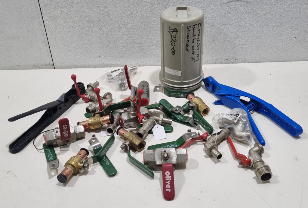 Assorted industrial fittings,includes various types of ball valves, bib tap lever action Lockable 20mm. Sold as lot